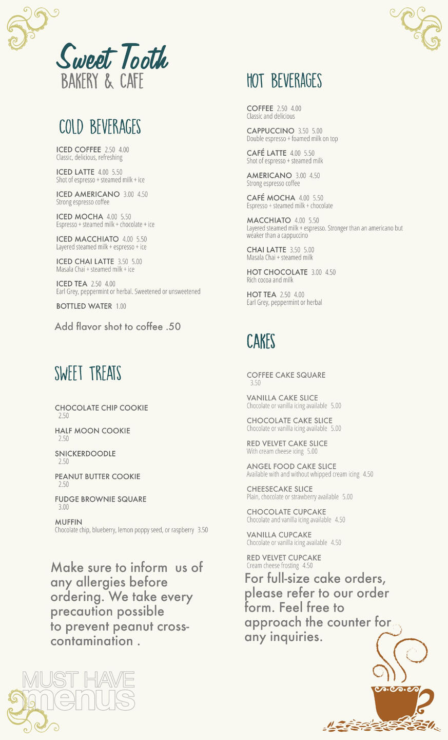 We opened our cafe with the goal of crafting the perfect cappuccino and providing a superior coffee experience. You can check out our menu right here (click to view full size):